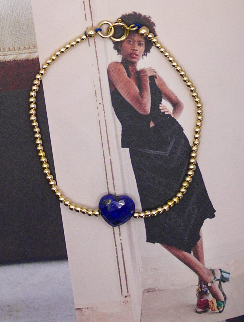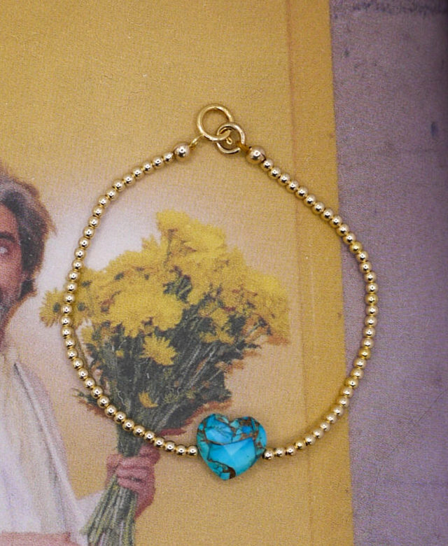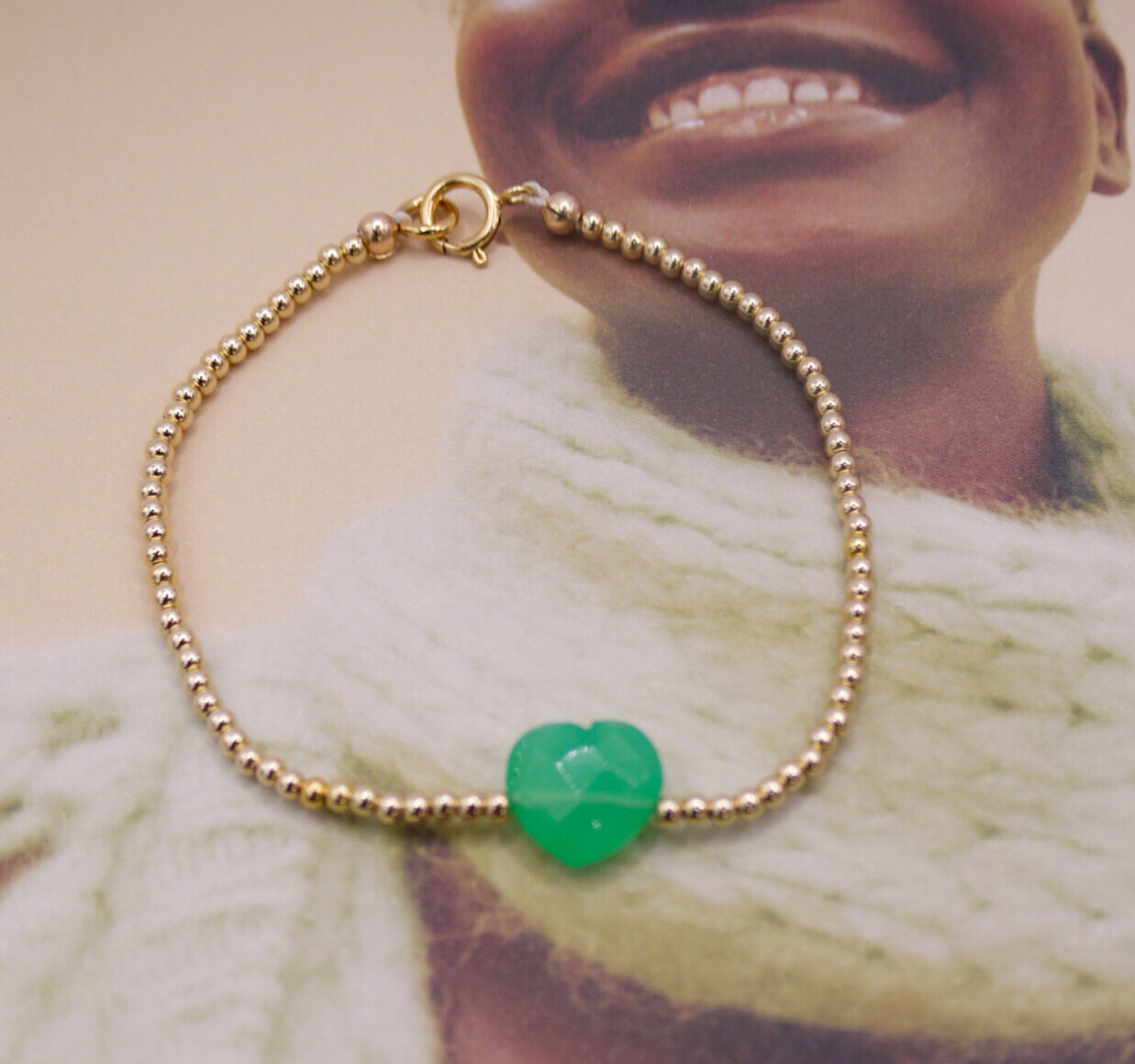 Ce bracelet raffiné en or 14 carats, gold filled, orné d’un coeur facettée en pierre fine, se décline en lapis lazuli, en chrysoprase, en quartz rose, en quartz rutile et en turquoise. Une touche élégante et personnalisée à porter chaque jour.