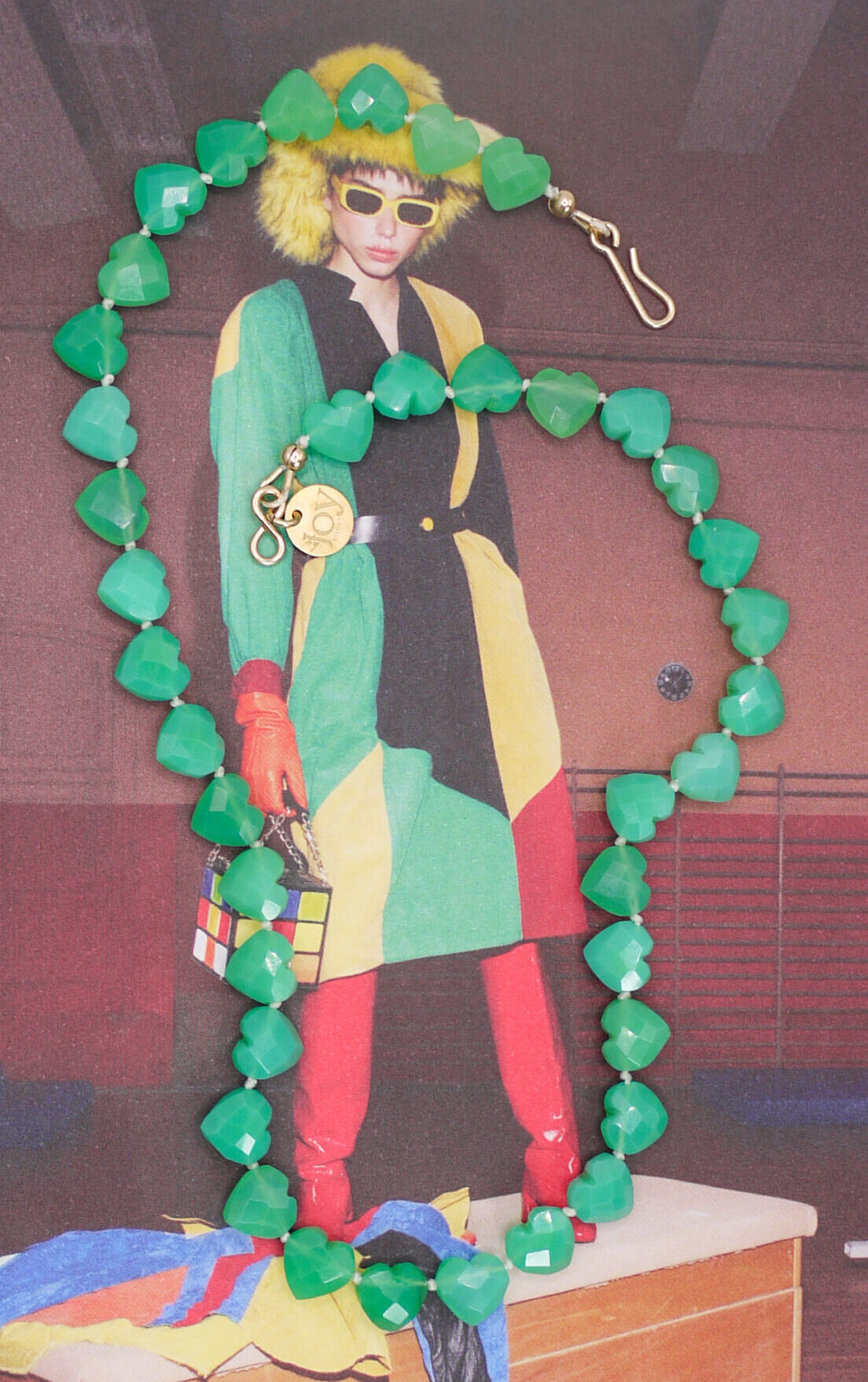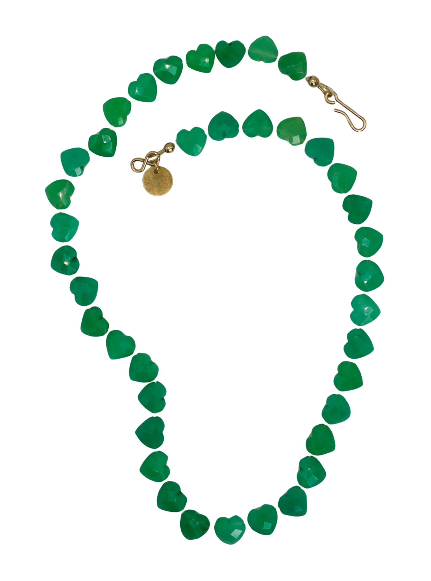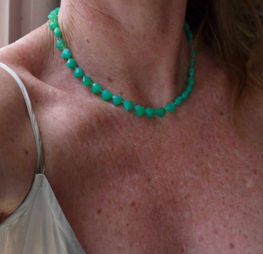Collier Baby Âme-Cœur en chrysoprase. Les pierres taillées en forme de petits cœurs facettés sont délicatement sculptées à la main. Irrésistible!