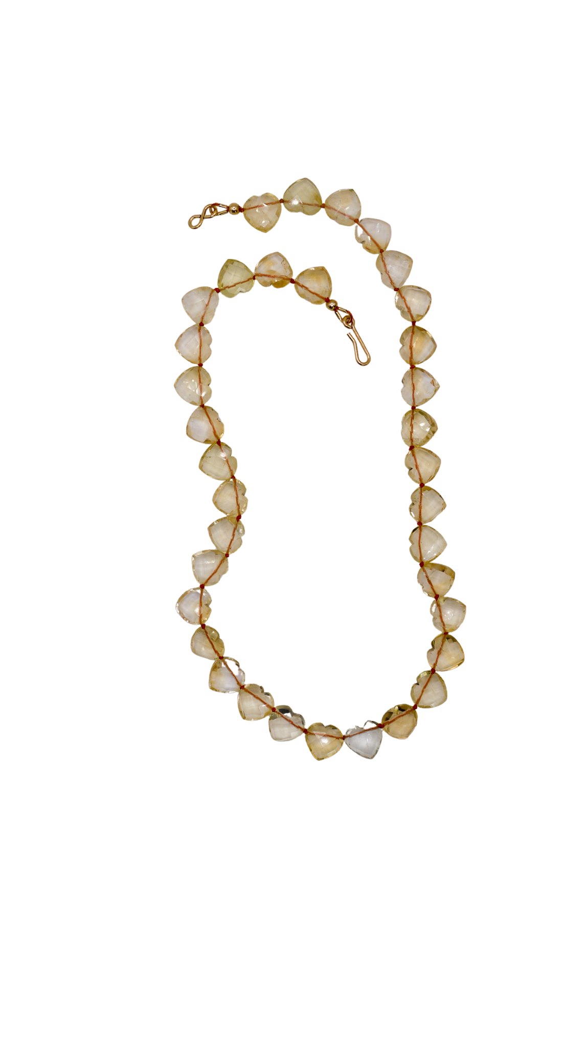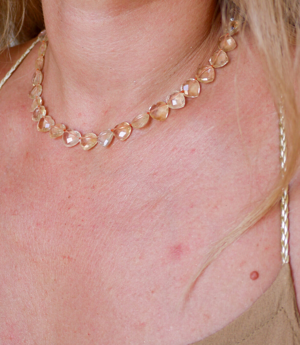 Collier Âme Cœur en citrine. Les pierres taillées en forme de petits cœurs facettés sont délicatement sculptées à la main. Irrésistible!