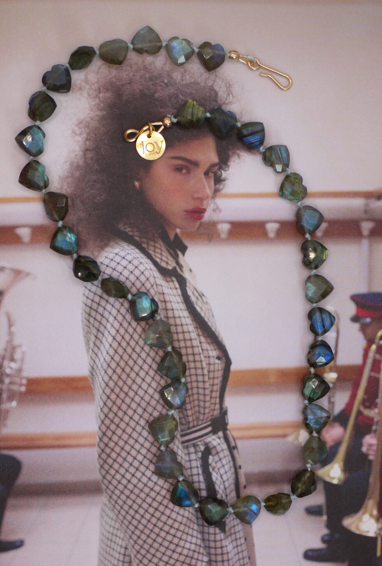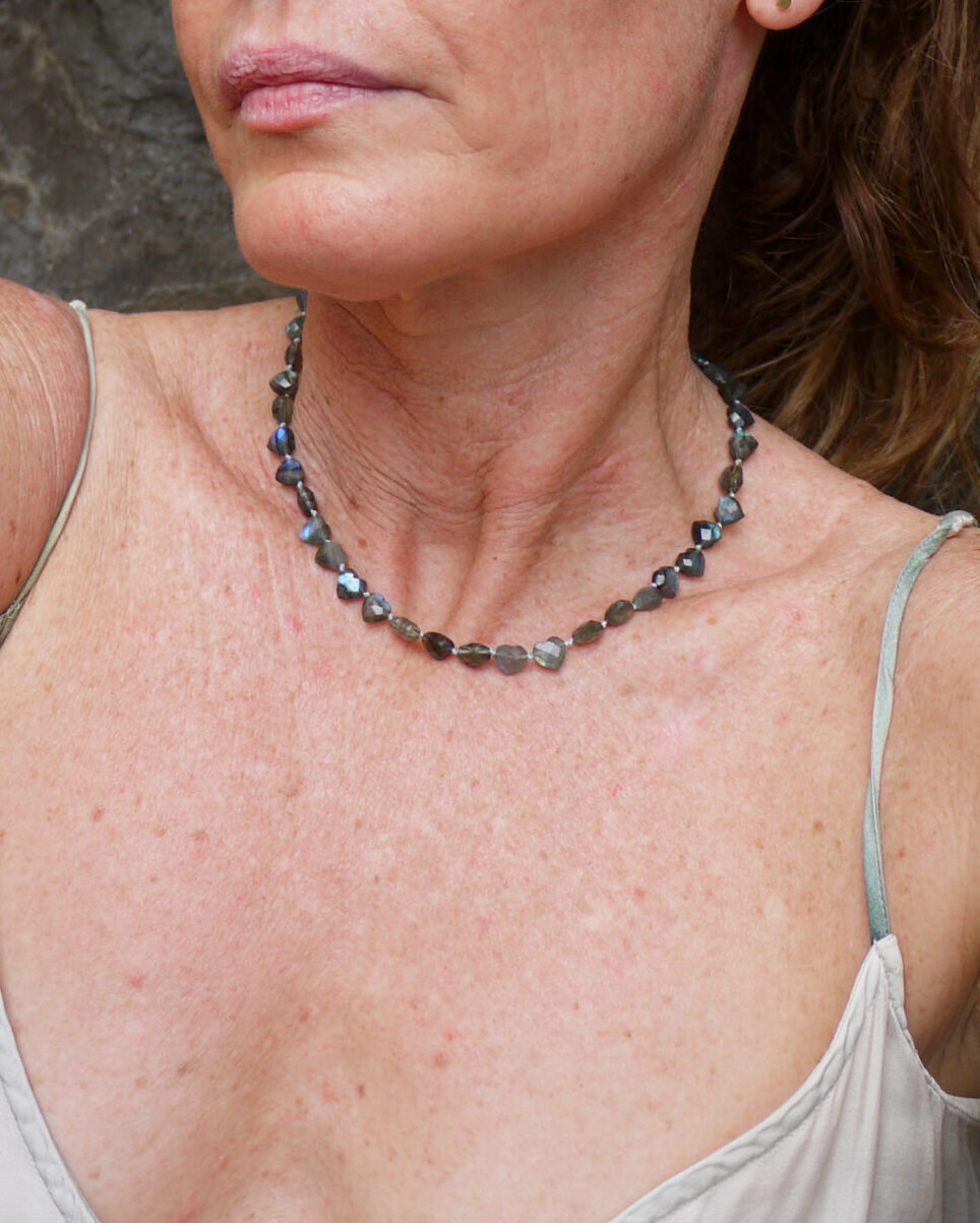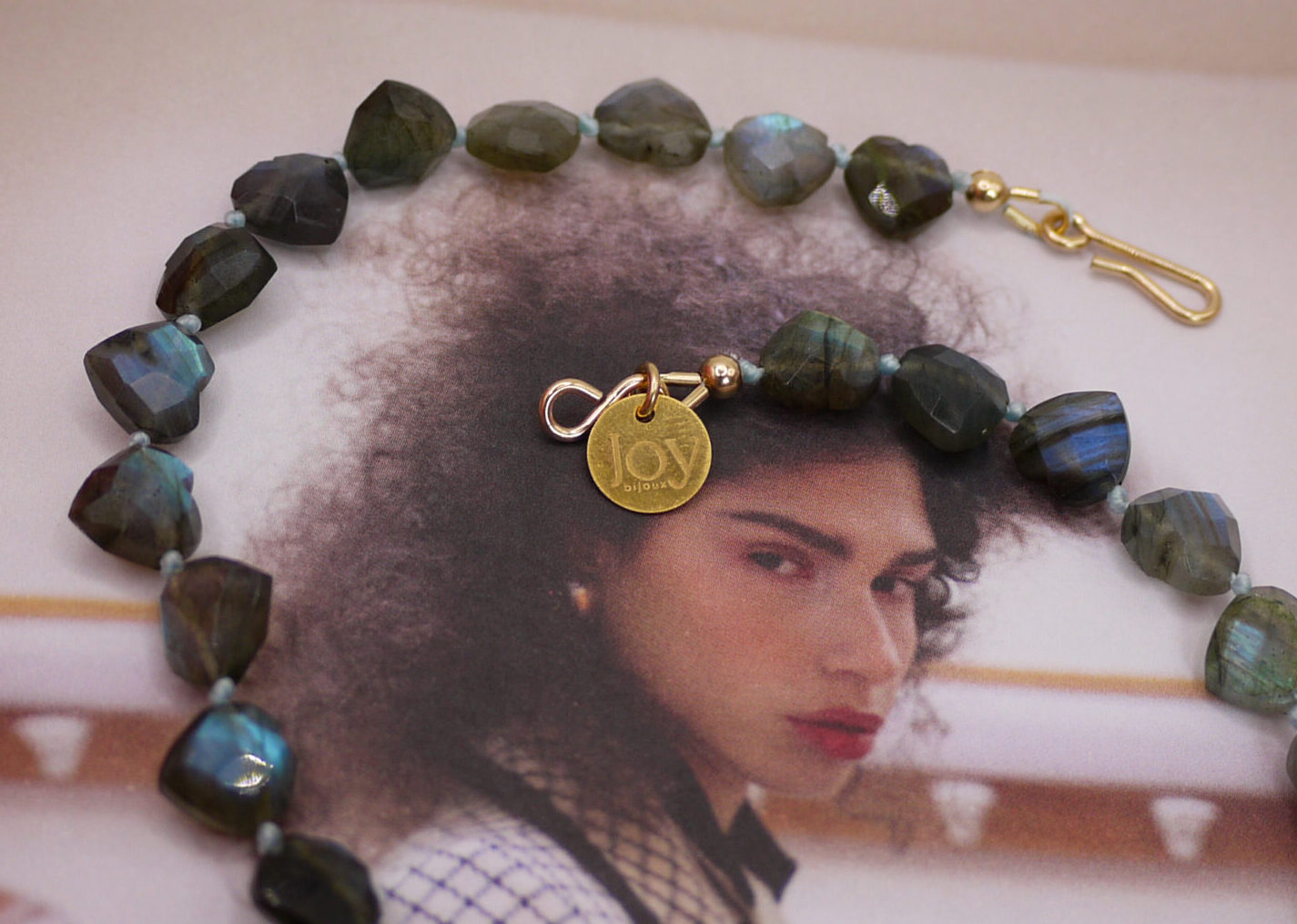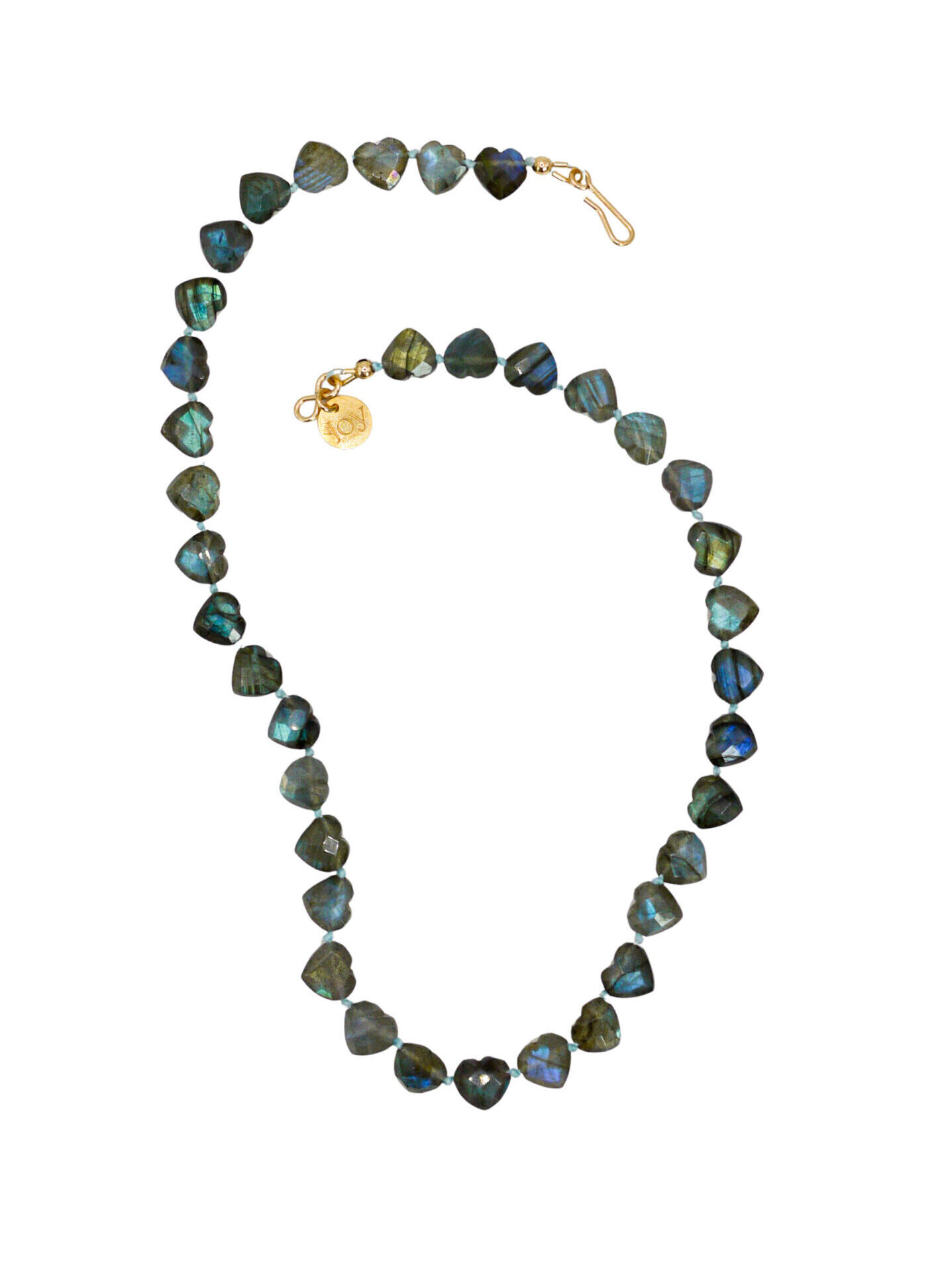 Collier Baby Âme-Cœur en labradorite. Les pierres taillées en forme de petits cœurs facettés sont délicatement sculptées à la main. Irrésistible!