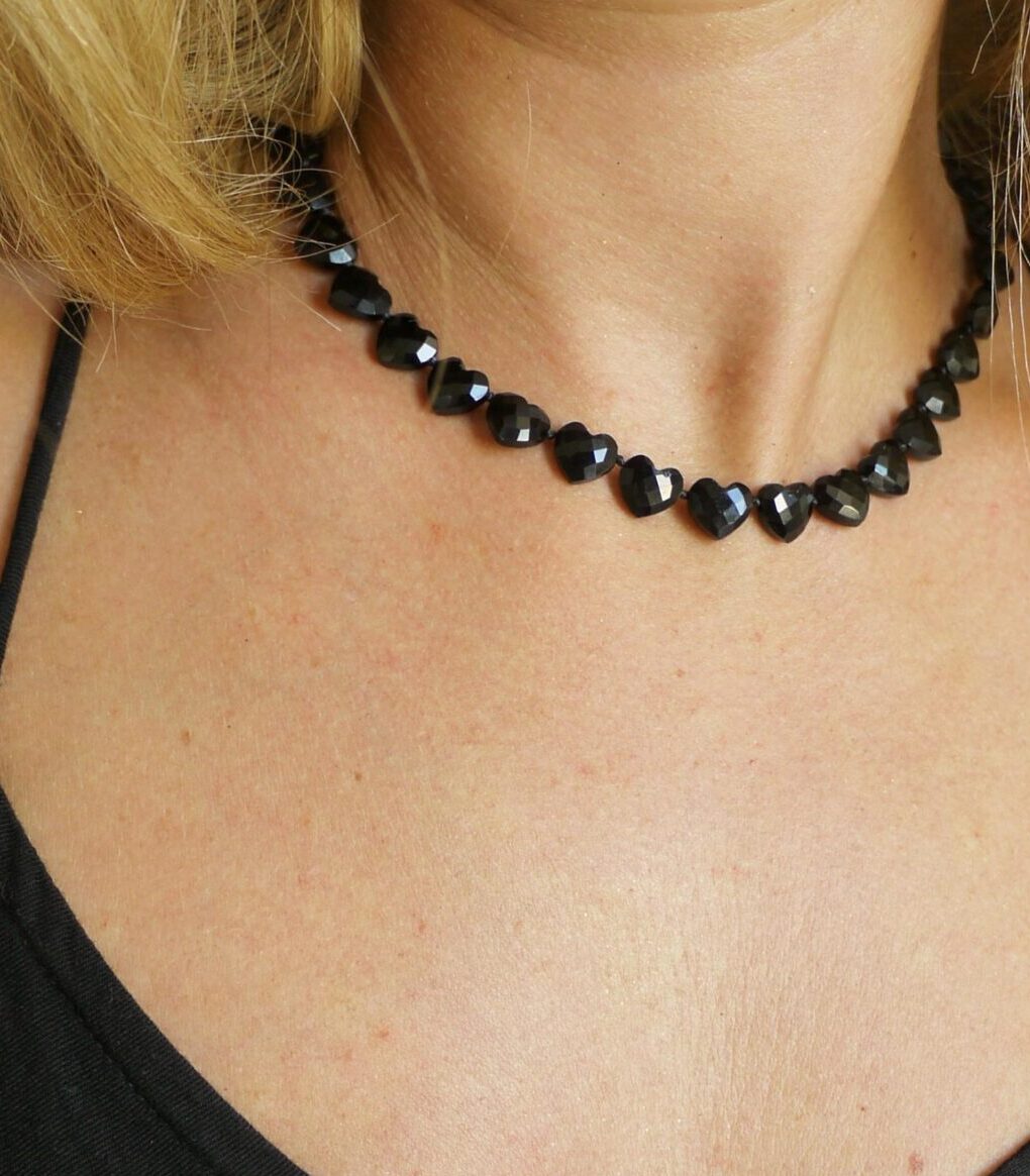 Collier Âme Cœur en onyx noir. Les pierres taillées en forme de petits cœurs facettés sont délicatement sculptées à la main. Irrésistible!