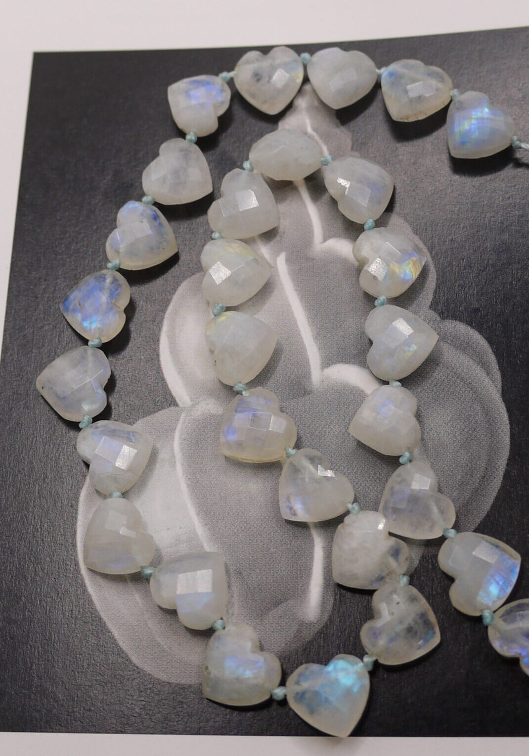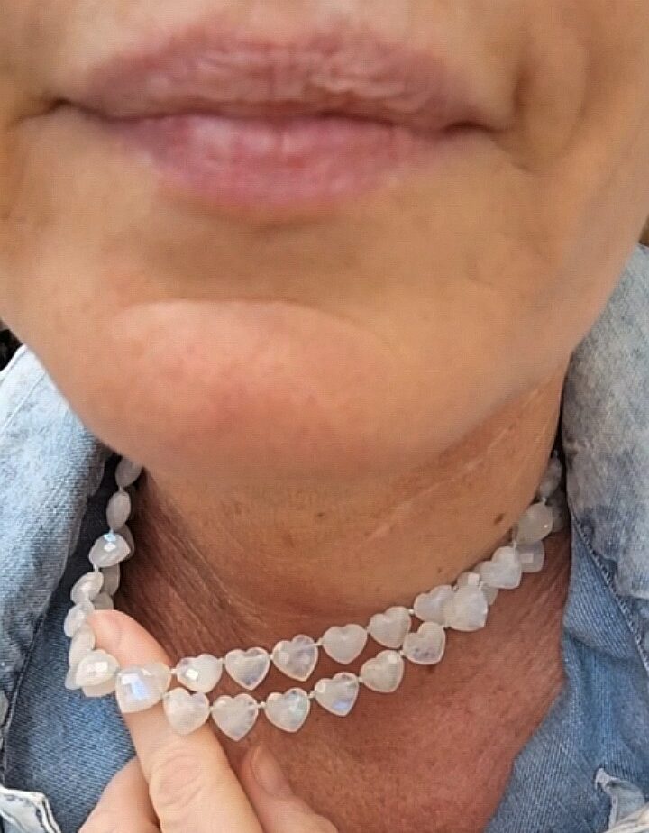 Collier Âme Cœur en pierre de lune. Les pierres taillées en forme de petits cœurs facettés sont délicatement sculptées à la main. Irrésistible!