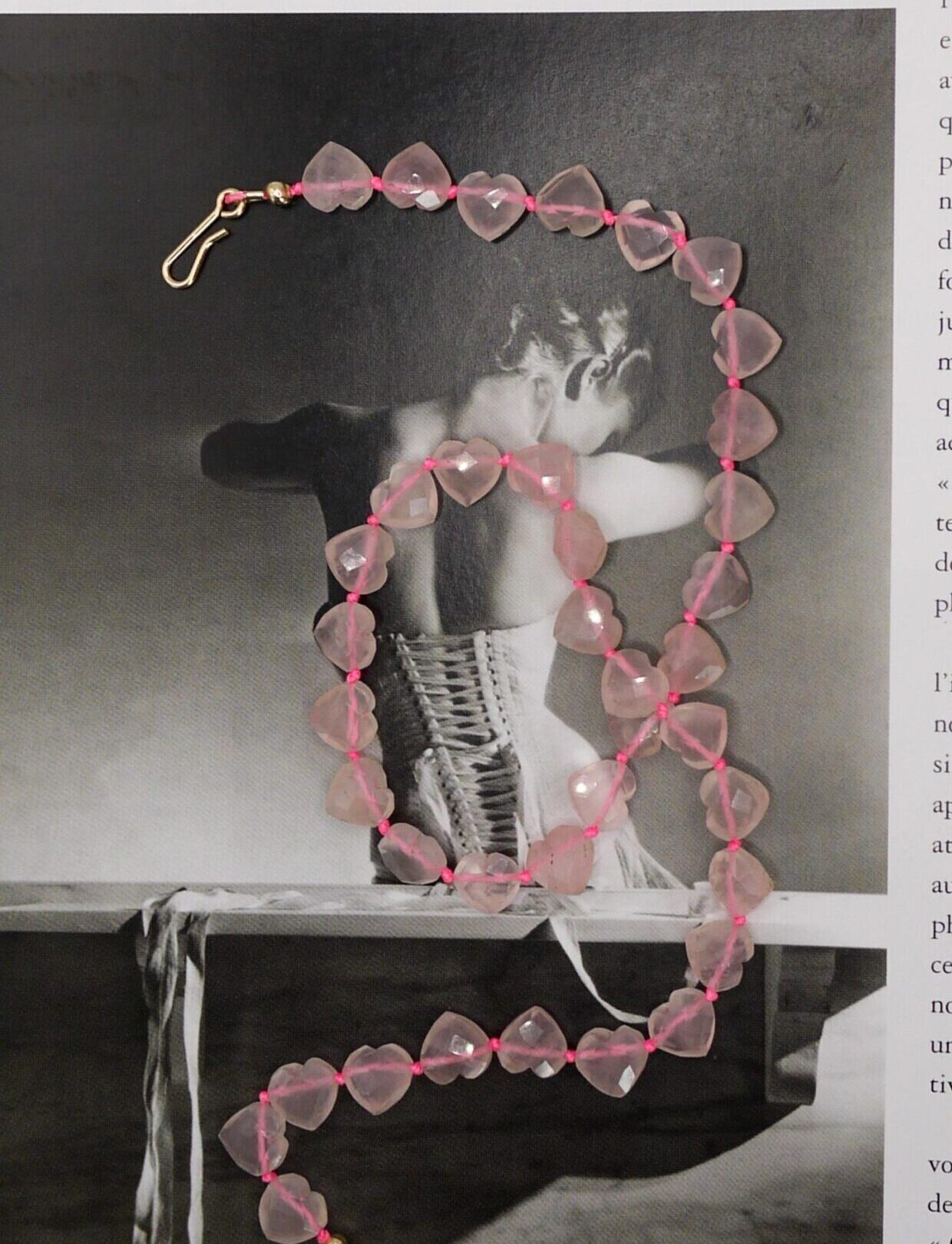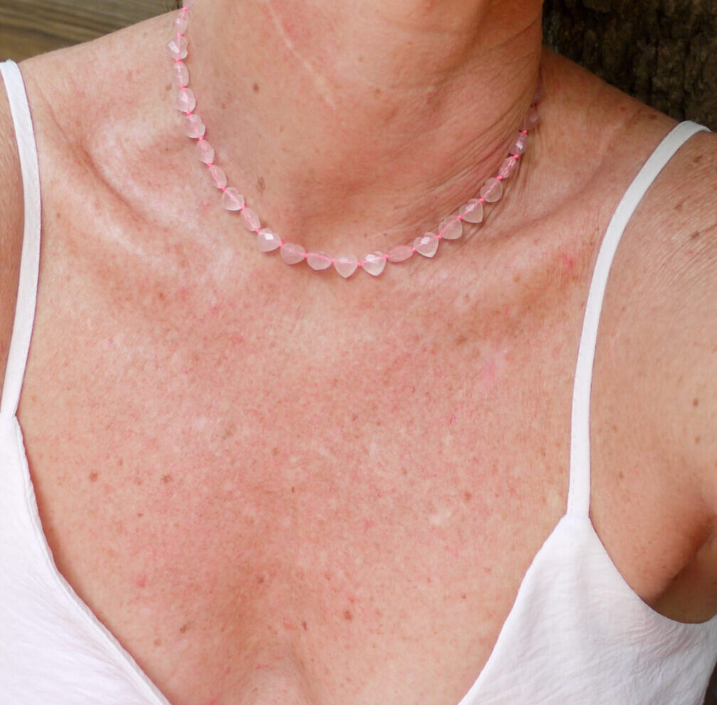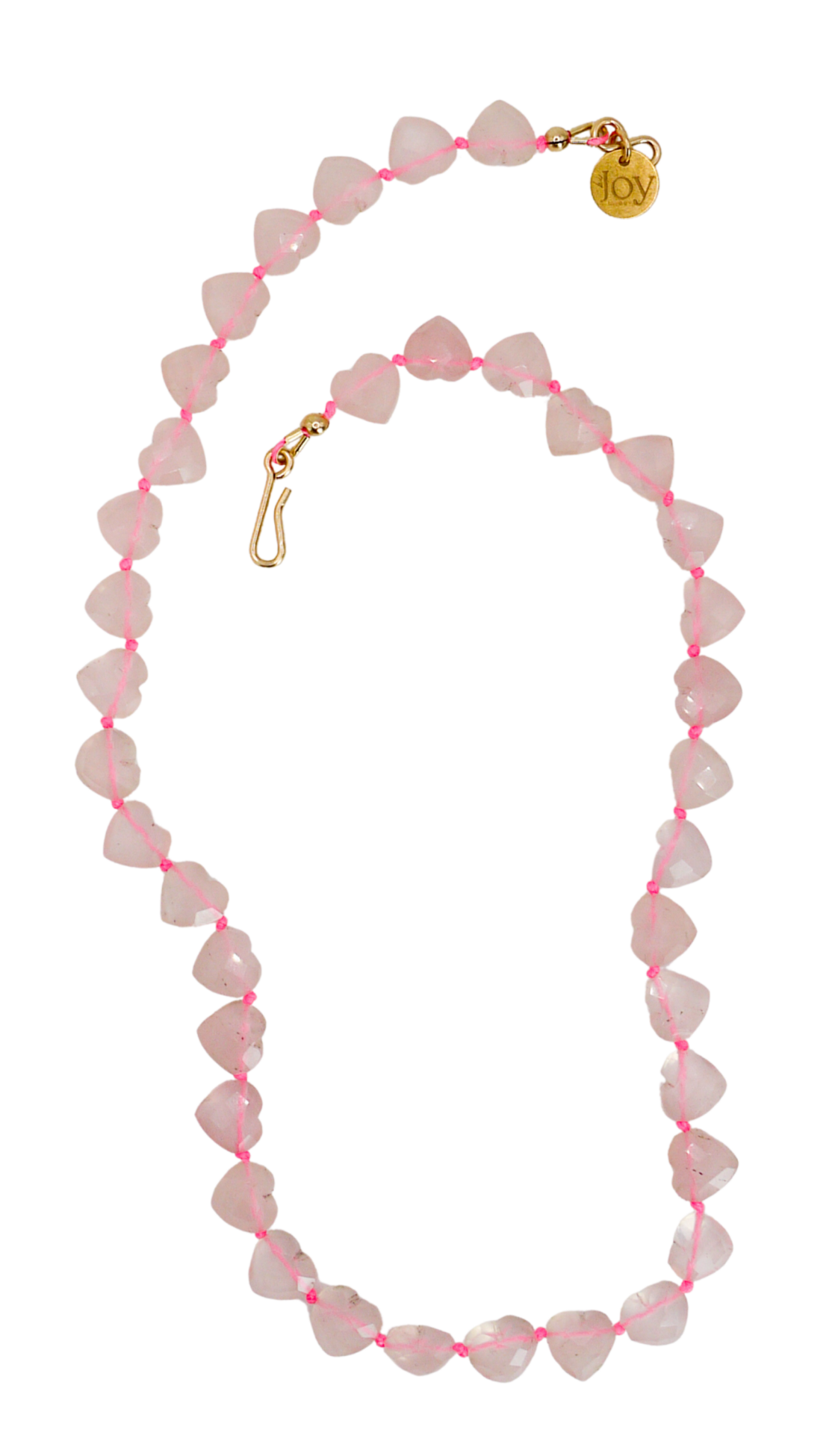 Collier Baby Âme-Cœur en quartz rose. Les pierres taillées en forme de petits cœurs facettés sont délicatement sculptées à la main et séparés par des petits noeuds. Irrésistible!