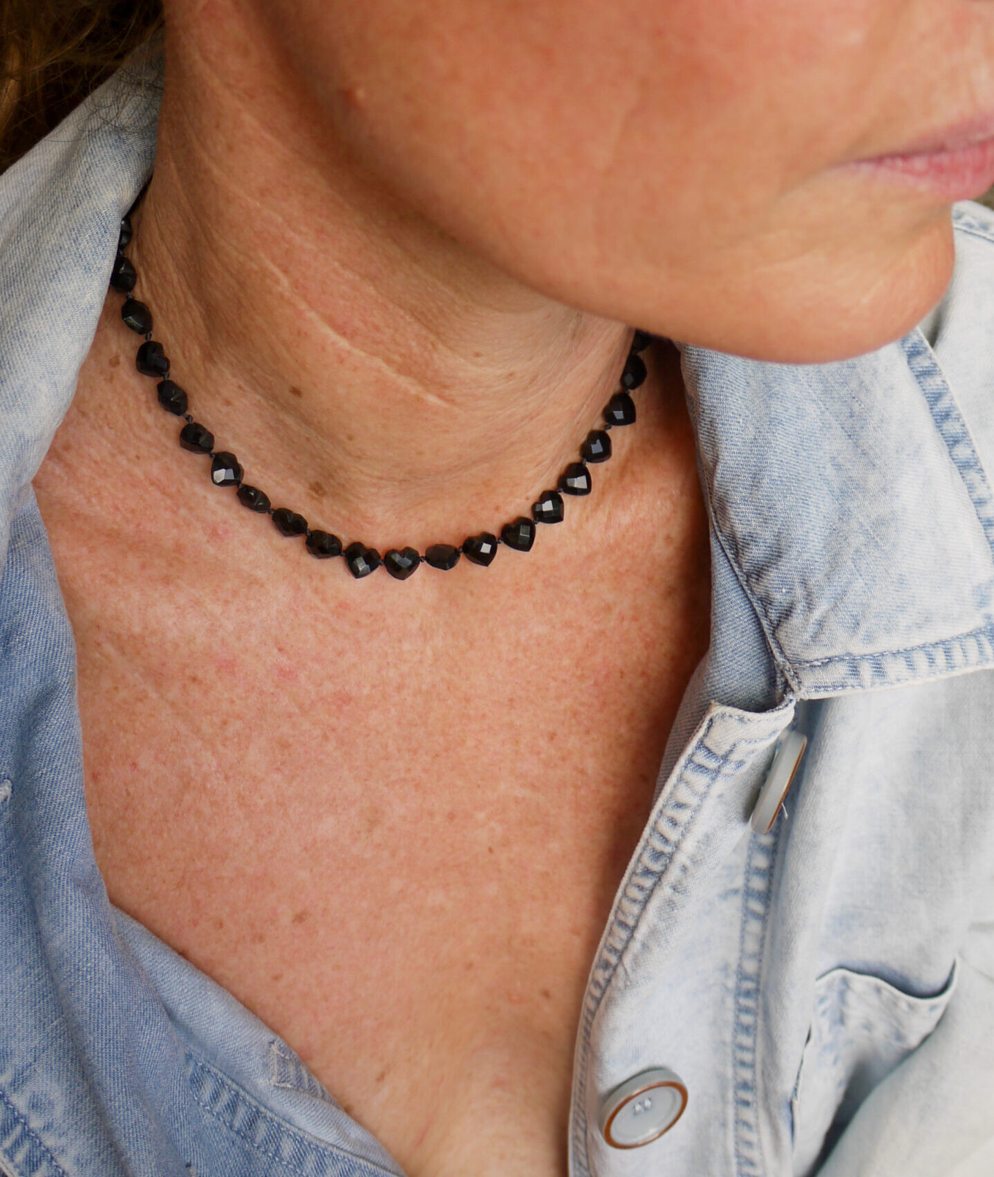 Collier Baby Âme-Cœur en onyx noir. Les pierres taillées en forme de petits cœurs facettés sont délicatement sculptées à la main. Irrésistible!