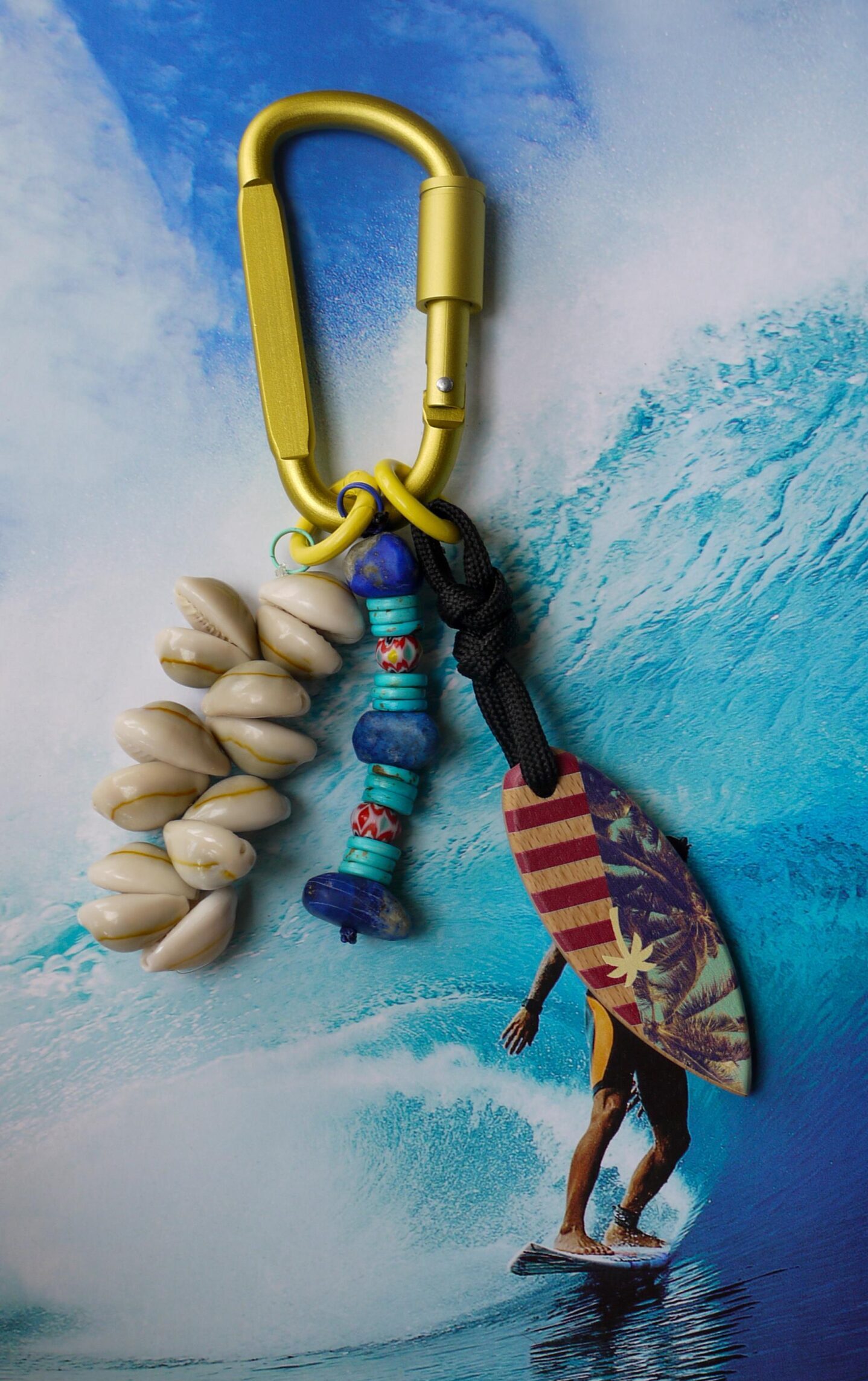Ce gri-gri de sac SUN, une création artisanale, marie un surf en bois de hêtre sculpté à la main et gravé par impression UV, des coquillages cauris naturels ainsi que des perles africaines et du lapis lazuli pour une touche de sérénité et de confiance. Le tout est monté sur un mousqueton jaune, prêt à pimper votre sac.