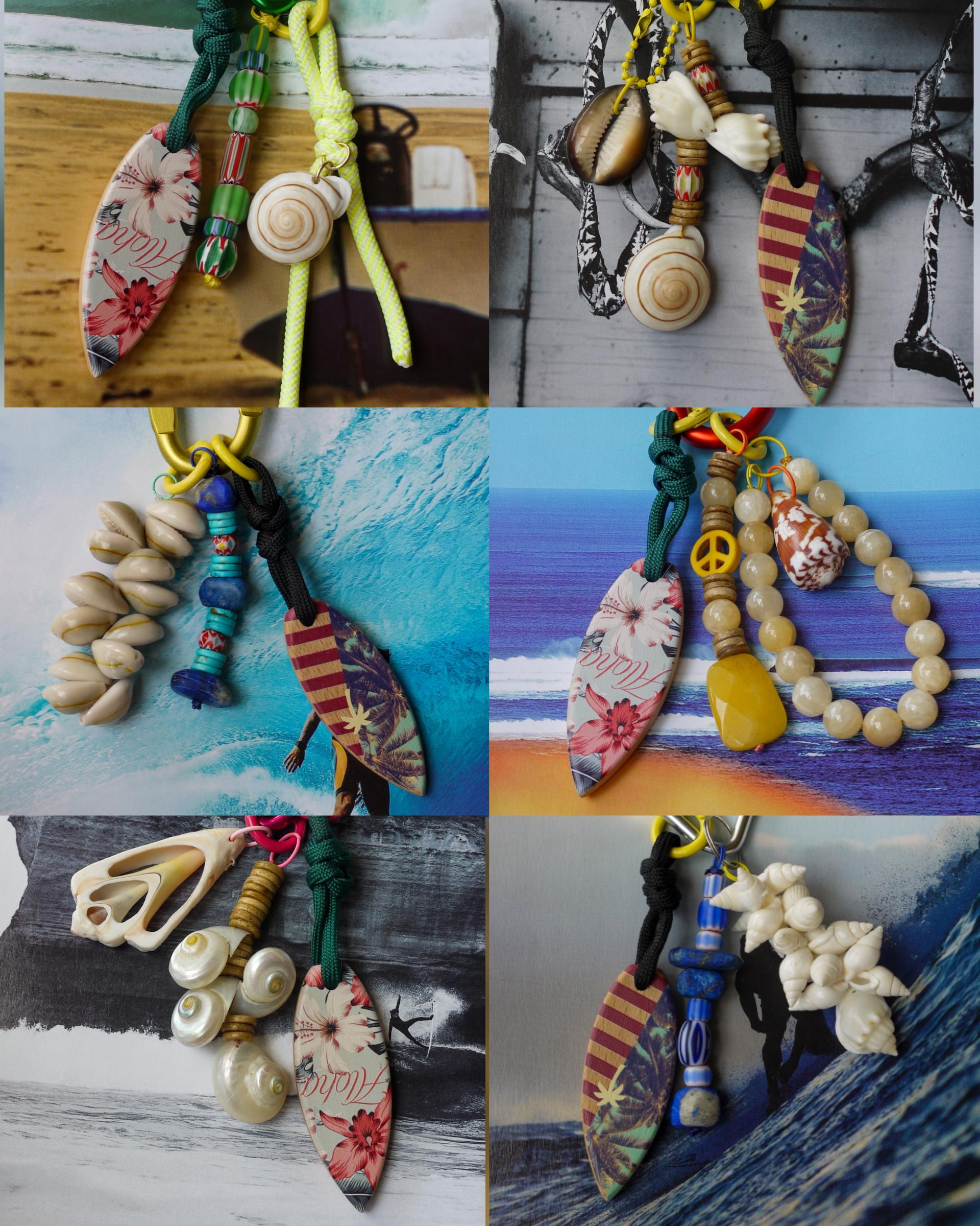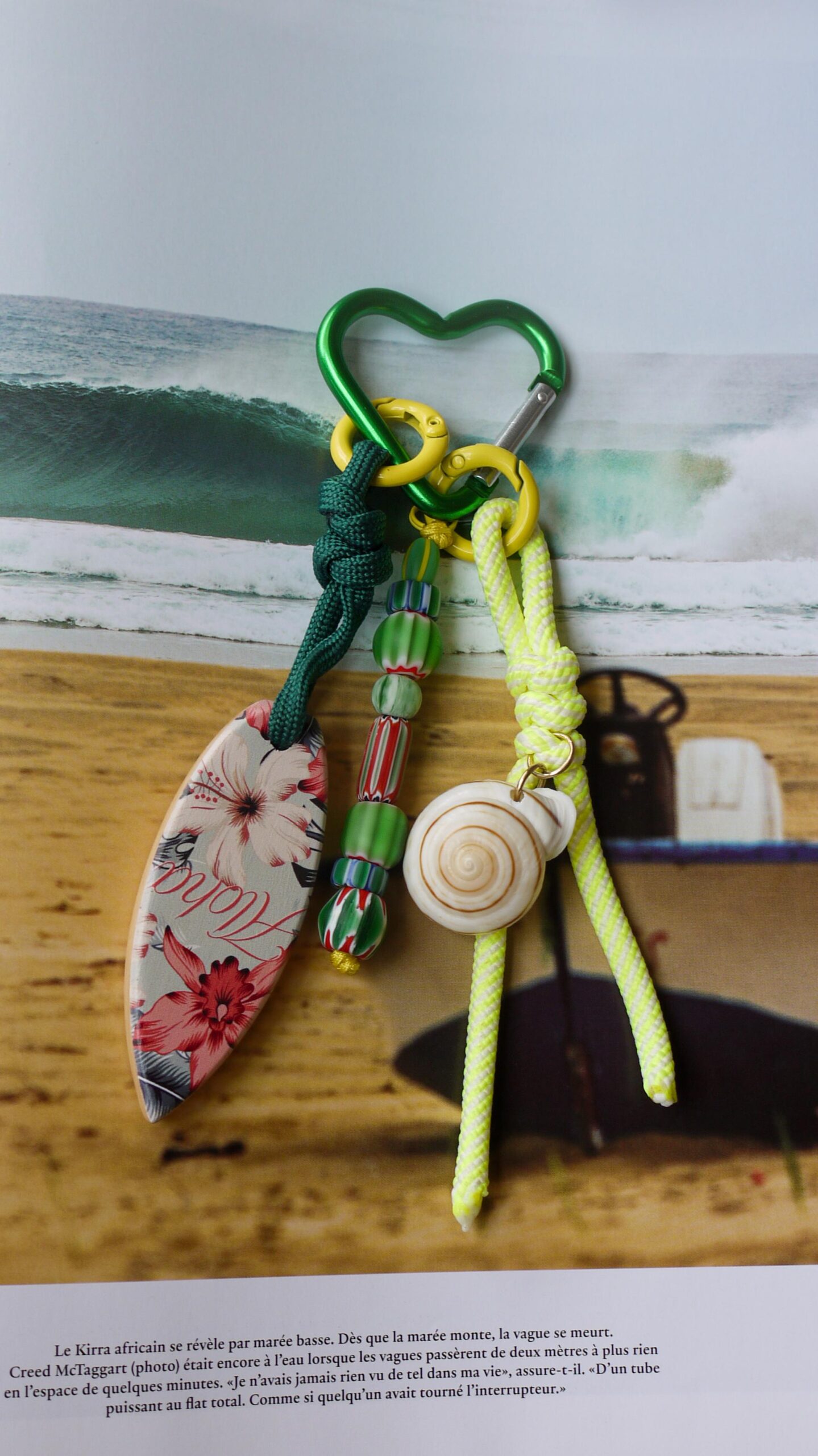 Ce gri-gri de sac WIND, une création artisanale, marie un surf en bois de hêtre sculpté à la main et gravé par impression UV, un coquillage naturel ainsi que des perles africaines. Le tout est monté sur un mousqueton cœur vert, prêt à pimper votre sac.