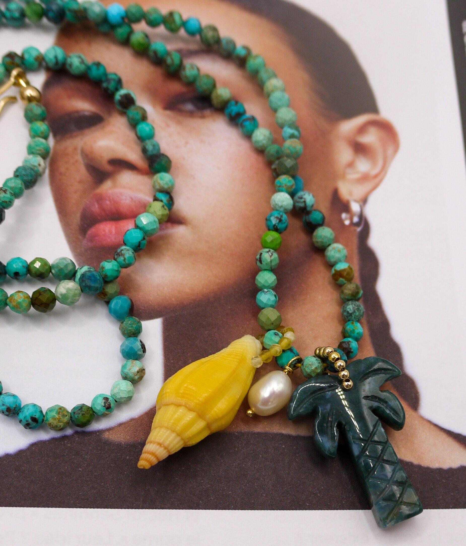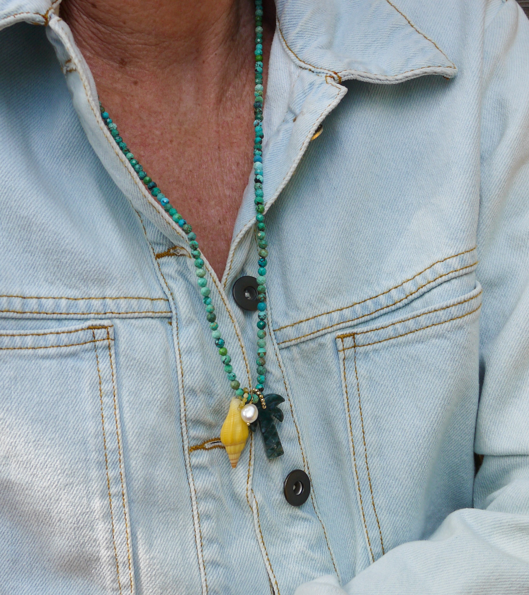 Sautoir en turquoise avec ses breloques amovibles : palmier sculpté en agate indienne & son porte-pendentif en perles en or 14 carats, gold filled, coquillage naturel & son porte-pendentif en opale jaune et perle d’eau douce blanche. Le véritable plus de ces sautoirs, c’est leur côté modulable : les breloques sont amovibles, ce qui permet de les retirer ou de les interchanger selon vos envies.